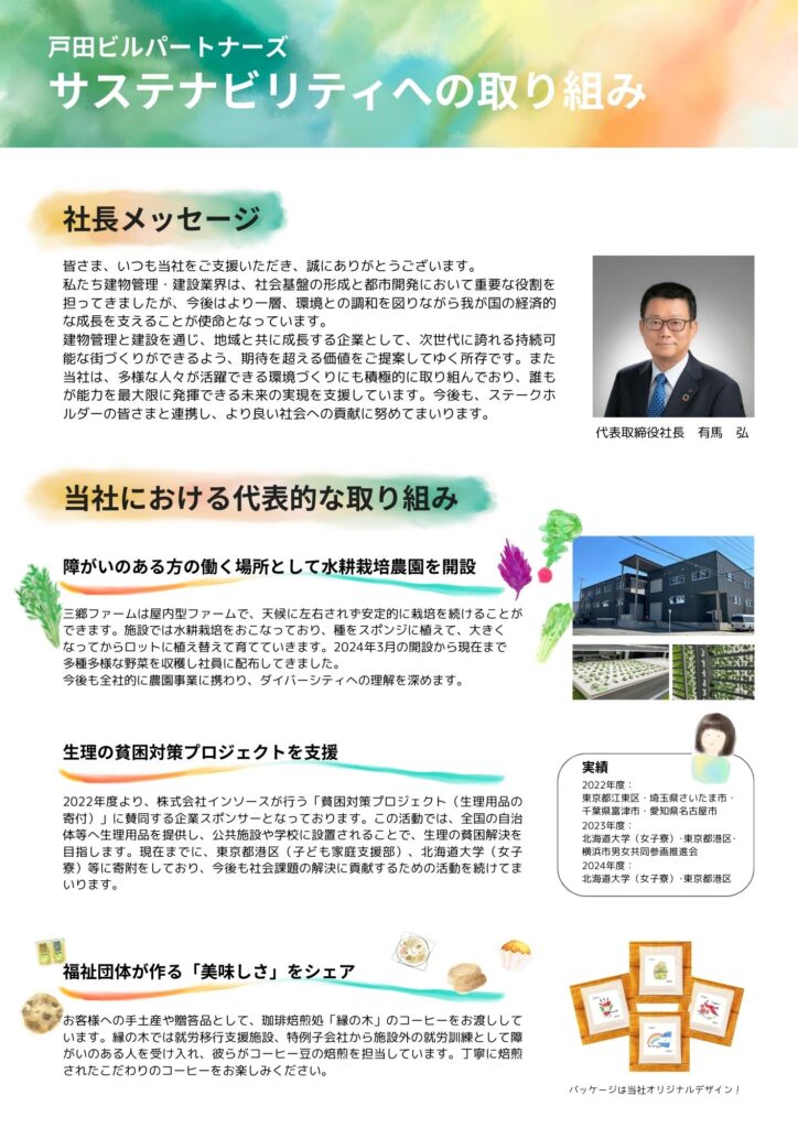 リーフレットには、会社の取り組みや社長のご紹介、